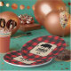 A background of red buffalo plaid contrasts against a kraft paper look panel on this Northwoods themed plate. The panel holds the text and features a bison (buffalo) between two pine trees. The crossed axe makes a custom logo below. Great addition to a birthday, bachelor party, seasonal event, or a buffalo plaid, or lumberjack themed celebration. Available with matching products.