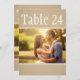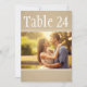 Elegant custom wedding table cards can be personalized with an engagement photo of the bride and groom. Design features white table number text on a rustic kraft brown paper background. To customize: type in the table number, click "change" by the default photo to upload your own photo, and add that individual table number card to your shopping cart. Repeat for all of the table numbers that you need.
