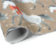 A winter holiday wrapping paper featuring watercolor-painted white horses with big red velvet holiday bows under a dusting of snow in a repeat pattern on a Kraft color wrapping paper.