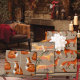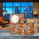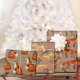 A holiday gift wrapping paper featuring a Kraft color background with watercolour-painted red foxes, each sheet with a different fox in a repeat pattern.