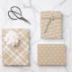 Rustic modern gift wrap set features three coordinating holiday wrapping paper sheets: kraft paper tan color and white tartan plaid, black with white script "Merry Christmas" text, and kraft with little white pine trees pattern.
