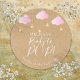 Featuring cute pink clouds and golden stars on strings, on a rustic kraft background, these baby shower favor stickers are perfect for sealing envelopes and baby shower favors. Add your celebration details in white to create the perfect baby shower sticker.