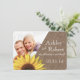 Printed design, Rustic country burlap and white lace and a pretty yellow sunflower save the date with photo. Upload your own favorite photo and personalize text for your upcoming wedding.