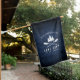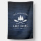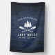 A beautiful, rustic themed house flag, featuring your family name and "Lake House" or other desired text along with its established date and location. This custom, unique design features a white silhouette of crossed boat oars and pine trees on a print of wood planks in rich blue colors. To see more designs like this, feel free to visit my store here at "Zazzle.com/Rustic_Charm". Thanks.