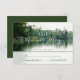 This rustic lakeside evergreens wedding RSVP card, created from my own personal kayaking photograph and with a subtle digital watercolor effect, features a beautiful rustic scene under an overcast sky with lightly rippled but calm water reflecting distant evergreens, cedar trees and rock structures, perfect for a mountain, lakeside, or riverside wedding celebration - by katz_d_zynes