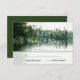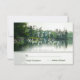 This rustic lakeside evergreens wedding RSVP card, created from my own personal kayaking photograph and with a subtle digital watercolor effect, features a beautiful rustic scene under an overcast sky with lightly rippled but calm water reflecting distant evergreens, cedar trees and rock structures, perfect for a mountain, lakeside, or riverside wedding celebration - by katz_d_zynes