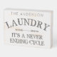 This beautiful, unique, one-of-a-kind rustic, personalized design features a rustic wood background with the words, "THE ANDERSON LAUNDRY IT'S A NEVER ENDING CYCLE" in black typography. Personalize this sign by adding your own personal information as all of the words can be changed to whatever you like. Makes a great wedding, anniversary, or housewarming gift. Click "personalize this template" to change the names, fonts, and colors to create a unique one of a kind design. If you need any help with customization please email me at ybnormalone @gmail.com. Thanks for stopping by www.zazzle.com/WhisperingPines. ©Karen Hall
