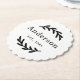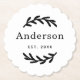 Elegant rustic wedding coasters featuring a scalloped edge design with delicate laurel branch accents on a clean white background. The family surname and established date in refined black typography form a classic monogram keepsake. A lovely reception table accent or personalized wedding favor. Personalize with your last name and year.