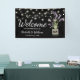 Country chic welcome wedding banner featuring a black background, string lights, a mason jar with purple lavender flowers, wrapped in burlap with the couples initials and a wedding template that is easily personalized.