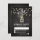 Country chic wedding response cards featuring a rustic black chalkboard background, string lights, a mason jar with purple lavender flowers, wrapped in burlap with the couples initials and a wedding rsvp template that is easily personalized.