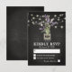 Country chic wedding response cards featuring a rustic black chalkboard background, string lights, a mason jar with purple lavender flowers, wrapped in burlap with the couples initials and a wedding rsvp template that is easily personalized.