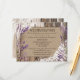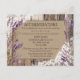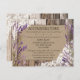 Lavender flowers over linen-look pattern, white chantilly lace, and barn wood background rustic wedding accommodations card.