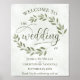 This beautiful sign is a wonderful way to welcome guests to your wedding celebration. It features a simple yet elegant design with a marbled white background and modern script lettering between sprigs of watercolor leaves in shades of sage green and pale olive.