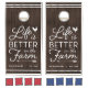 Upgrade your outdoor setup at your farmhouse abode with this cute rustic cornhole set featuring the phrase "life is better on the farm" in white lettering accented with a rooster and an arrow on a faux wood plank background. Personalize with your family name and/or year established beneath.