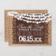 Rustic Country Save the Date Postcards with a background of printed burlap design and vintage brown paper with glowing strings of lights at the top. These country wedding save the date postcards have room on the back for your return address and a blank space for you to address the postcards to your guests. These are great for country weddings and barn weddings. The burlap design is just a high quality printed design (not actual burlap fabric).