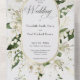 AVAILABLE WITH OR WITHOUT A QR CODE OR DINNER SELECTION OPTIONS. This wedding invitation features a visually captivating design, starting with a white faux watercolor paper background that sets an elegant and sophisticated tone. Overlaid on this background is a subtle white blur, adding a touch of softness and depth to the overall appearance. Encircling the invitation is a delicate gold oval frame composed of white lilies and lily of the valley flowers. These graceful blooms are intricately detailed, showcasing their natural beauty and representing purity and new beginnings. The lilies and lily of the valley flowers intertwine with lush greenery, creating an enchanting frame that exudes a sense of romance and charm.