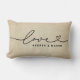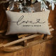 A rustic lumbar pillow featuring Love in flowing black heart script with customizable couple names on a textured beige linen background. The earthy, farmhouse-inspired design makes a charming wedding gift, anniversary keepsake, or cozy living room accent. All text is fully editable to personalize with any couple's names.