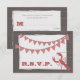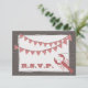 A rustic beach wedding r.s.v.p. featuring an illustration on front of red gingham bunting and an illustration of a lobster over a barnwood background.