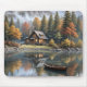 A cozy log cabin stands by the edge of a lake surrounded by vibrant autumn trees and towering mountains in the mist with rowboat