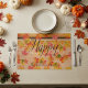 Bring rustic charm to your Thanksgiving table with this customizable paper placemat. The design features vibrant maple leaves in fiery reds and golden yellows scattered across a detailed faux wood grain background. A beautiful script reads "Happy Thanksgiving," with space below for you to add your family name, making each placemat a personal touch. Printed on disposable paper for easy cleanup, this placemat is both a beautiful and practical addition to your holiday decor.