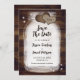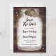 Custom mason jar wedding save the date card featuring burlap hearts with monograms and a mason jar against a barn wood background adorned with twinkle lights. Easily personalize online. Matching items available to complement these romantic monogrammed rustic country wedding save the dates.