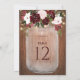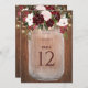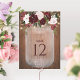 These larger sized table number cards are perfect for your boho country wedding. The design features a bouquet of watercolor burgundy and blush flowers decorated with string lights with a background of rustic brown wood.