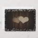 Rustic wedding save the date card featuring a mason jar with string lights and adorned with two burlap hearts on a barn wood background. Easily personalize this romantic rustic wedding save the date online. Matching items available to complement this rustic country wedding save the date.