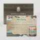 Rustic Mason Jar Wedding Reception RSVP Card. Let all your guests rsvp in style with these Rustic Mason Jar Wedding Reception RSVP Cards. Features a brown wood background with floral elements on the edges. A parchment paper like background label holds all your rsvp text in serif and sans serif fonts. A polka dot blue background is behind the label. On the backside is the wood background with a mason jar that holds the text RSVP. Underneath the jar is the wedding location.