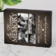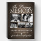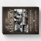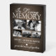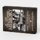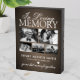 Personalized family memorial wood box sign featuring a stylish black/brown background, 5 photos of your lost loved one, the text "in loving memory", their name, birth/death dates, a white heart, and the remembrance saying "gone but never forgotten".