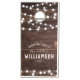 Rustic dark wooden corn hole set with modern string light design featuring your custom family name and year established alongside minimal typography reading "Adventure awaits" on a printed wooden backdrop. Enjoy this fun outdoor family game, perfect for an outdoor summer wedding, a gift for newlyweds, or a housewarming party.