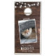 Rustic dark wooden corn hole set with modern country barn string light design featuring your custom family name and another line of custom text alongside 2 pictures of your pet family on a printed brown wooden backdrop. Please personalize with 2 favorite photos of your cats or any other animal member of your family and enjoy this fun outdoor family game at your wedding. Perfect for an outdoor summer wedding, a gift for newlyweds, or a housewarming party.