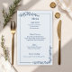 Share your wedding feast with guests in style using this rustic monochrome wedding menu card. Featuring floral accents and elegant script fonts, this design complements barn, country, or garden weddings perfectly. Available in dusty blue, sage green, or warm taupe, the one-color palette creates a timeless rustic look. Customize with your courses or buffet selections to complete your wedding reception stationery suite.