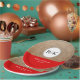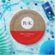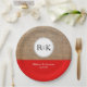 The design on this paper plate features a photo of textured burlap and is accented with a solid red stripe near the bottom. A white circle, on the burlap, features a black customizable monogram of the bride and groom. Customizable text, on the red part of the plate, features the names of the bride and groom and their wedding date.