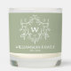 This stylish candle features a monogram initial surrounded by a wreath of branches and leaves along with last name and date family was established on a sage green background. If giving as a gift, you can personalize this candle on the back (leave those areas blank, too if you don't want any printing.) Perfect for housewarming, wedding, newlywed or anniversary gift. MORE colors and designs in our collection.