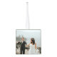 This ornament features places for three photos, plus names and date along with a monogram surrounded by rustic branches. The background color is a stylish sage green but it can be changed by clicking "customize further."