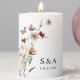 Rustic Monogrammed Boho Pillar Candle. Add a meaningful glow to your ceremony or décor with this rustic boho pillar candle, featuring a monogram surrounded by delicate wildflowers and grasses in soft terracotta, golden yellow, and sage green hues. The artwork pops against a white wax background, while the black script adds a timeless touch. Perfect for centerpieces, keepsakes, or a unity display—personalize it to reflect your unique story.