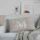 Custom-designed decorative lumbar pillow featuring personalized monogram and family name in modern hand calligraphy printed on a rustic burlap background.