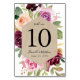 Elegant floral table number cards featuring the table number and your wedding details inside a geometric frame of watercolor roses and greenery in shades of blush pink, peach, burgundy, purple & green with a kraft paper background. Personalize by adding your names and wedding date. The design repeats on the back of the card. Designed to coordinate with our Rustic Moody Floral wedding collection.