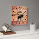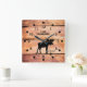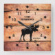 Personalize this rustic wood look wall clock design with your own text. Acrylic wall clock is printed in a cedar look plank style pattern accented with a black silhouetted moose. Would fit especially great into any mountain cabin, hunting camp lodging or man-cave decor. Available in your choice or round or square faces.
