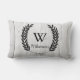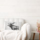 Detailed moose sketch on a white washed wood planks print on the front side of the pillow. The backside of the pillow features a black laurels wreath frame containing your choice of personalized monogram letter and family name in black text.
