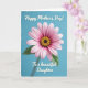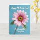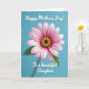 This card shows a large daisy-like flower centered on a calm blue background, like a gentle hug captured in a garden moment ❤️. The many petals shift from pale pink at the tips to deep fuchsia closer to the middle, drawing your eye inward. At the center, a tight cluster of golden-yellow stamens surrounds a darker core, creating a cozy, affectionate focal point. A slim green stem and a small leaf peek up from below, adding a quiet, natural touch that feels like someone thoughtfully picked it for you 🌼. Along the edges, a slightly distressed white border frames the scene, giving it a soft, rustic look. Across the top, the message “Happy Mother’s Day!” appears in white, flowing lettering against the blue. Beneath the flower, “To a beautiful Daughter” is placed in matching white, gently curved lettering just above the lower border. Soft, diffused lighting highlights the petal shading and the golden center against the blue field.