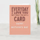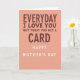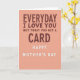 This card features a soft peach background that feels like a gentle blush behind the message ❤️. Centered on the front is a stacked, multi-line layout that guides your eyes downward like a quiet conversation. Most of the words appear in a deep reddish-brown with a lightly worn, stamped texture that adds a cozy, lived-in look. Between those darker lines, a few phrases switch to a creamy off-white, creating little pauses that feel like a tender emphasis. The wording moves through “EVERYDAY I LOVE YOU” and “BUT TODAY YOU GET A CARD,” mixing everyday affection with a small, affectionate wink. Near the bottom, “HAPPY MOTHER’S DAY” stands out as the final line, set larger and easy to spot 🌼. All the text stays centered with even spacing, and the alternating colors make the message feel warm without any extra illustrations. The only visuals are the textured lettering in reddish-brown and off-white against the smooth, peach-toned background.