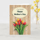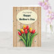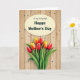 Designed with a soft, affectionate look, this card features a bouquet of seven tulips gathered across the lower half, mixing deep red and sunny yellow petals, with a few flowers showing two-tone blends ❤️. Slender green stems and wide leaves fan outward, as if the blooms are being offered with a gentle, friendly gesture. Above them sits a creamy oval frame that draws the eye upward like a quiet spotlight. Inside the oval, a short greeting appears in dark green, with the first line in a flowing cursive style and the main Mother’s Day message in a larger, classic serif style, both centered. A faint shadow behind the lettering adds a slight lifted effect without feeling heavy. The background resembles vertical wooden planks in a pale, cozy tone, dotted with soft-focus specks in muted blue and forest green like tiny confetti or dew 🌼. The creamy oval frame has a thin border and rests near the top center, leaving open space around the text for an airy, balanced layout.