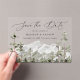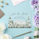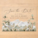 Rustic save the date cards featuring 'Save the Date' in elegant calligraphy script, complemented by a scenic landscape of watercolor evergreen trees and mountains on a frosted or transparent acrylic background. Personalize these woodland mountain save the dates with your names, wedding date, and location. Perfect for couples hosting destination weddings in the mountains or embracing nature-inspired wedding themes.