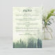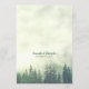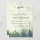 This rustic wedding menu features a lacy script calligraphy title and a wilderness mountain scene of green pine trees shrouded in mist or fog. The back has space for the names of the couple and wedding date. Perfect for an outdoor reception.