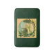 A vintage rustic image; a circular vignette featuring mountains and conifer trees with snow in the branches surrounded by a floral motif.