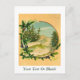 A vintage rustic image; a circular vignette featuring mountains and conifer trees with snow in the branches surrounded by a floral motif. Add your own text.