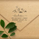 Create your own personalized name and address stamp using this beautiful template. The design features round rustic typography with your custom address and your last name in elegant script. Above there is a mountain and forest landscape with the sun setting or rising. Click on the "personalized button", and add your family name with your address to make it yours! It´s a great choice for all year round, not only Christmas and winter mail!
