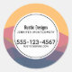 Business stickers with a graphic illustration featuring many mountain tops with bright yellow sunlight setting behind the mountains. Made with geometric polygonal shapes.Simple minimalist design. Colors range from dark blue to desert red. A white circle layered over top with your info inside.