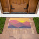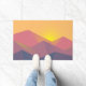 Door mat with a graphic illustration featuring many mountain tops with bright yellow sunlight setting behind the mountains. Made with geometric polygonal shapes.Simple minimalist design. Colors range from dark blue to desert red.
